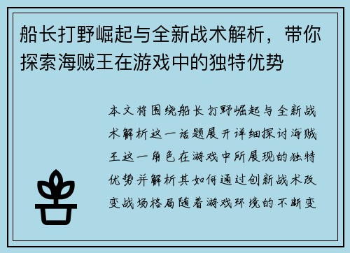 本文将围绕“船长打野崛起与全新战术解析”这一话题展开,详细探讨海贼王这一角色在游戏中所展现的独特优势,并解析其如何通过创新战术改变战场格局。随着游戏环境的不断变化,船长作为打野角色逐渐成为游戏中的一个重要趋势。本文从四个方面对这一现象进行详细分析,具体包括:船长的独特技能解析、船长打野的战略优势、海贼王角色的团队协作特点,以及船长如何利用地图和资源优势在对局中占据主动。通过这些角度的深入剖析,玩家们将更好地理解船长作为打野角色的崛起过程以及其背后的战术理念,进而提升自己的游戏技巧。