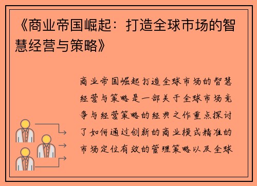 《商业帝国崛起:打造全球市场的智慧经营与策略》是一部关于全球市场竞争与经营策略的经典之作,重点探讨了如何通过创新的商业模式、精准的市场定位、有效的管理策略以及全球化的资源整合,打造一个在世界范围内具有深远影响的商业帝国。文章从多个角度分析了商业帝国的形成路径,尤其是在现代全球化环境下,如何通过智慧经营和策略布局,提升企业的竞争力,最终实现跨越国界的商业成功。本文将从四个方面详细阐述《商业帝国崛起》中的核心思想,包括商业帝国的构建理念、全球市场的战略布局、现代企业管理的核心策略以及资源整合与创新。通过对这些方面的深入探讨,我们能够更清晰地理解全球商业帝国崛起的过程与奥秘。