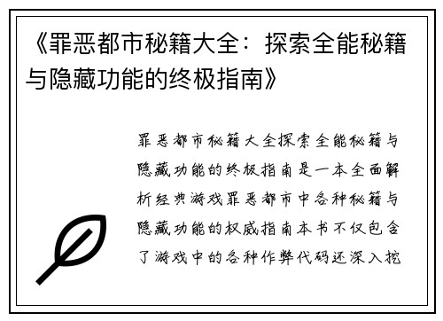 《罪恶都市秘籍大全:探索全能秘籍与隐藏功能的终极指南》是一本全面解析经典游戏《罪恶都市》中各种秘籍与隐藏功能的权威指南。本书不仅包含了游戏中的各种作弊代码,还深入挖掘了隐藏的游戏玩法、特殊场景、以及其他玩家未曾发掘的细节。文章的目的是帮助玩家通过秘籍快速掌握游戏技巧,探索隐藏的乐趣和无限可能,让游戏体验更加丰富和刺激。无论是新玩家还是资深玩家,都能从中找到值得尝试的秘籍,享受游戏的更多乐趣。
