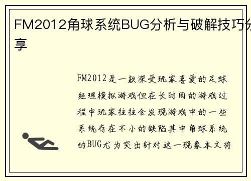 FM2012是一款深受玩家喜爱的足球经理模拟游戏,但在长时间的游戏过程中,玩家往往会发现游戏中的一些系统存在不小的缺陷,其中角球系统的BUG尤为突出。针对这一现象,本文将对FM2012角球系统中的一些BUG进行详细分析,并分享一些破解技巧。文章将从四个方面展开讨论,分别是角球策略的设置与优化、角球队员的角色分配、角球战术的执行与调整以及对抗角球BUG的技巧。这些内容将帮助玩家更好地应对角球系统的缺陷,并提高在比赛中的表现。