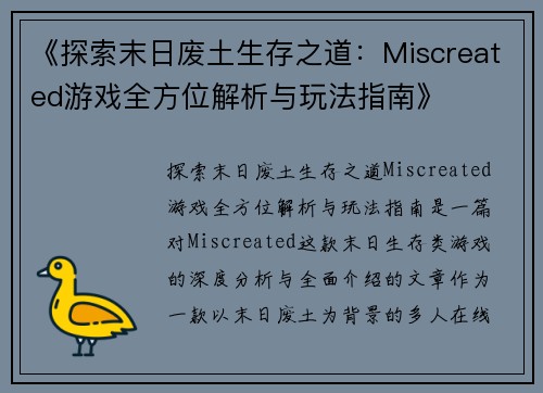 《探索末日废土生存之道:Miscreated游戏全方位解析与玩法指南》是一篇对《Miscreated》这款末日生存类游戏的深度分析与全面介绍的文章。作为一款以末日废土为背景的多人在线生存游戏,《Miscreated》将玩家置身于一个充满危险与挑战的世界,玩家需要在这个环境中生存、探索、建设和与其他玩家互动。本文将从四个方面对《Miscreated》进行全面解析:游戏的背景与设定、核心玩法与机制、战斗与生存策略以及社交与多人互动。通过对这些方面的详细阐述,玩家能够全面了解这款游戏的魅力所在,帮助新玩家快速入门,同时也为老玩家提供一些深度的玩法思考与技巧。本文旨在通过细致的分析,使读者对《Miscreated》有一个全面的了解,并能够在游戏中获得更好的体验与策略。
